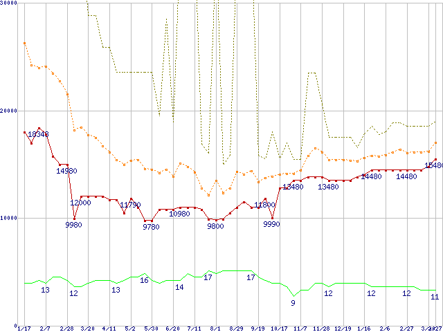 PC3-12800 2GB×3枚組みセットの価格推移↑前グラフ↓次グラフ(2009年1月17日〜2010年3月27日)※このグラフは過去のデータも税率5%相当に調整した税込み相当額のグラフです。 税率変更や、総額表示方式導入(2004年4月)の影響は除いています。●関連グラフメモリ主要製品の最安値推移メモリ主要製品(最安値1万円以上)の最安値推移PC3-12800(DDR3-1600) DDR3 SDRAM DIMMの最安値推移●凡例最安値(点線部は販売店未確認または未調査)平均値最高値ショップ数