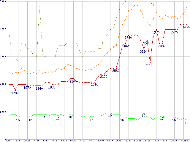 PC2-6400 1GB×2枚組みセットの価格推移↑前グラフ↓次グラフ(2009年1月17日〜2010年3月27日)※このグラフは過去のデータも税率5%相当に調整した税込み相当額のグラフです。 税率変更や、総額表示方式導入(2004年4月)の影響は除いています。●関連グラフメモリ主要製品の最安値推移2GBモジュール/1GBモジュール×2枚の最安値推移メモリ主要製品(最安値5千円未満)の最安値推移PC2-6400(DDR2-800) DDR2 SDRAM DIMMの最安値推移●凡例最安値(点線部は販売店未確認または未調査)平均値最高値ショップ数
