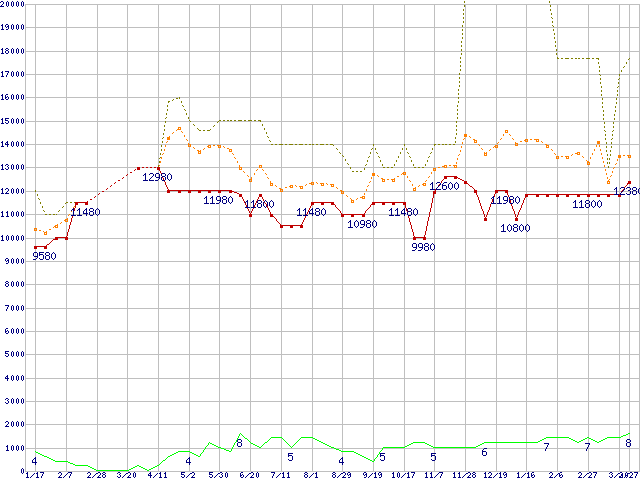 PC2-6400 4GBの価格推移↑前グラフ(2009年1月17日〜2010年3月27日)※このグラフは過去のデータも税率5%相当に調整した税込み相当額のグラフです。 税率変更や、総額表示方式導入(2004年4月)の影響は除いています。●関連グラフメモリ主要製品の最安値推移4GBモジュール/2GBモジュール×2枚の最安値推移メモリ主要製品(最安値1万円以上)の最安値推移PC2-6400(DDR2-800) DDR2 SDRAM DIMMの最安値推移●凡例最安値(点線部は販売店未確認または未調査)平均値最高値ショップ数
