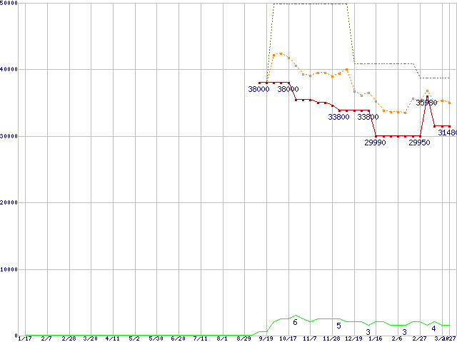 PC3-10600 4GB×2枚組みセットの価格推移↑前グラフ↓次グラフ(2009年1月17日〜2010年3月27日)※このグラフは過去のデータも税率5%相当に調整した税込み相当額のグラフです。 税率変更や、総額表示方式導入(2004年4月)の影響は除いています。●関連グラフメモリ主要製品の最安値推移メモリ主要製品(最安値1万円以上)の最安値推移PC3-10600(DDR3-1333) DDR3 SDRAM DIMMの最安値推移●凡例最安値(点線部は販売店未確認または未調査)平均値最高値ショップ数