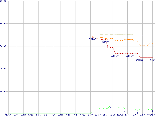 PC2-6400 4GB×2枚組みセットの価格推移↑前グラフ↓次グラフ(2009年1月17日〜2010年3月27日)※このグラフは過去のデータも税率5%相当に調整した税込み相当額のグラフです。 税率変更や、総額表示方式導入(2004年4月)の影響は除いています。●関連グラフメモリ主要製品の最安値推移メモリ主要製品(最安値1万円以上)の最安値推移PC2-6400(DDR2-800) DDR2 SDRAM DIMMの最安値推移●凡例最安値(点線部は販売店未確認または未調査)平均値最高値ショップ数