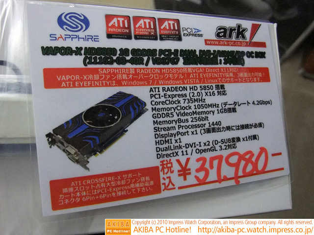 ![]() | AKIBA PC Hotline! 2010年3月27日号 今週見つけた新製品:ビデオカード SAPPHIRE VAPOR-X HD5850 1G GDDR5 PCI-E DUAL DVI/HDMI/DP OC VERSION(11162-03-40R) |