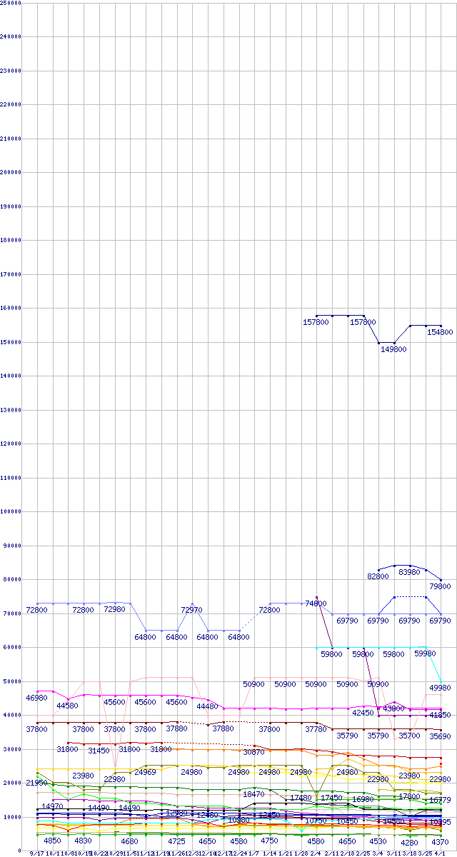 HDD/SSD主要製品の最安値推移↑前グラフ↓次グラフ(2009年9月17日〜2010年4月1日)※このグラフは過去のデータも税率5%相当に調整した税込み相当額のグラフです。 税率変更や、総額表示方式導入(2004年4月)の影響は除いています。凡例2.5インチ ミドルクラスSSD 512GB (512GB,MLC)2.5インチSSD(SandForce製コントローラ) 200GB (200GB,MLC)CTFDDAC256MAG-1G1 (256GB,MLC)SSDSA2SH064G1C5 (64GB,SLC)2.5インチ ミドルクラスSSD 256GB (256GB,MLC)2.5インチ ローエンドSSD 256GB (256GB,MLC)SDSA2MH160G2C1/R1/R5 (160GB,MLC)CTFDDAC128MAG-1G1 (128GB,MLC)2.5インチSSD(SandForce製コントローラ) 100GB (100GB,MLC)SSDSA2SH032G1 (32GB,SLC)WD2001FASS (2TB,64MB)2.5インチSSD(SandForce製コントローラ) 50GB (50GB,MLC)ST32000641AS (2TB,64MB)2.5インチ ミドルクラスSSD 128GB (128GB,MLC)SDSA2MH80G2C1/R1/R5 (80GB,MLC)X25-M(G2)OEM品SSD (80GB,MLC)WD10TPVT (1TB,8MB,12.5mm厚)2.5インチ ローエンドSSD 128GB (128GB,MLC)WD1500HLFS (150.0GB)ST32000542AS (2TB,32MB)2.5インチ ミドルクラスSSD 64GB (64GB,MLC)HDS722020ALA330 (2TB,32MB)2.5インチ ローエンドSSD 64GB (64GB,MLC)WD20EARS (2TB,64MB)HD203WI (2TB,32MB)SSDSA2MP040G2R5 (40GB,MLC)ST31500541AS (1.5TB,32MB)ST31500341AS (1.5TB,32MB)WD6400BPVT (640GB,8MB)WD1002FAEX (1TB,64MB)2.5インチ ローエンドSSD 32GB (32GB,MLC)2.5インチ ミドルクラスSSD 32GB (32GB,MLC)HM641JI (640GB,8MB)WD6400BEVT (640GB,8MB)HD154UI (1.5TB,32MB)WD15EARS (1.5TB,64MB)WD10EALS (1TB,32MB)ST31000528AS (1TB,32MB)HDS721010CLA332 (1TB,32MB)HD103SJ (1TB,32MB)WD5000BEVT (500GB,8MB)HD103SI (1TB,32MB)HTS545050B9A300 (500GB,8MB)WD10EARS (1TB,64MB)HTS545032B9A300 (320GB,8MB)HDS721050CLA362 (500GB,16MB)ST3500418AS (500GB,16MB)※製品名をクリックすると個別のグラフを表示します※点線部は販売店が確認できなかった、または調査データがないことを示します