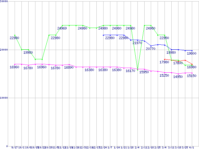 | HDD/SSD主要製品(最安値1万5千円〜2万円未満)の最安値推移 |