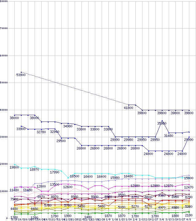 メモリ主要製品の最安値推移↑前グラフ↓次グラフ(2009年9月19日〜2010年4月3日)※このグラフは過去のデータも税率5%相当に調整した税込み相当額のグラフです。 税率変更や、総額表示方式導入(2004年4月)の影響は除いています。凡例PC3-12800 4GB×2枚組みセットPC3-10600 4GB×2枚組みセットPC2-6400 4GB×2枚組みセットPC3-12800 2GB×3枚組みセットPC3-10600 4GBPC3-10600 2GB×3枚組みセットPC2-6400 4GBPC3-12800 2GB×2枚組みセットPC3-12800 1GB×3枚組みセットPC3-10600 2GB×2枚組みセットPC3-10600 1GB×3枚組みセットPC2-6400 2GB×2枚組みセットPC3-12800 1GB×2枚組みセットPC3-12800 2GBPC3-10600 1GB×2枚組みセットPC3-10600 2GBPC2-6400 1GB×2枚組みセットPC2-6400 2GBPC3-12800 1GBPC3-10600 1GBPC2-6400 1GB※製品名をクリックすると個別のグラフを表示します※点線部は販売店が確認できなかった、または調査データがないことを示します