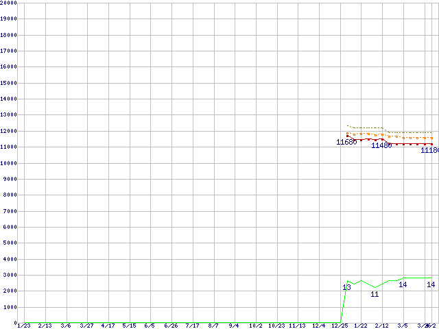 Core i3-530 (2.93GHz)の価格推移↑前グラフ↓次グラフ(2009年1月23日〜2010年4月2日)※このグラフは過去のデータも税率5%相当に調整した税込み相当額のグラフです。●関連グラフCPU主要製品の最安値推移CPU主要製品(最安値1万円〜2万円未満)の最安値推移Intel系CPUの最安値推移LGA1156 (L3キャッシュ4MB,Dual Core,GPU内蔵,Hyper-Threading,TDP 73〜87W)の最安値推移●凡例最安値(点線部は販売店未確認または未調査)平均値最高値ショップ数
