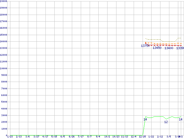 Core i3-540 (3.06GHz)の価格推移↑前グラフ↓次グラフ(2009年1月23日〜2010年4月2日)※このグラフは過去のデータも税率5%相当に調整した税込み相当額のグラフです。●関連グラフCPU主要製品の最安値推移CPU主要製品(最安値1万円〜2万円未満)の最安値推移Intel系CPUの最安値推移LGA1156 (L3キャッシュ4MB,Dual Core,GPU内蔵,Hyper-Threading,TDP 73〜87W)の最安値推移●凡例最安値(点線部は販売店未確認または未調査)平均値最高値ショップ数