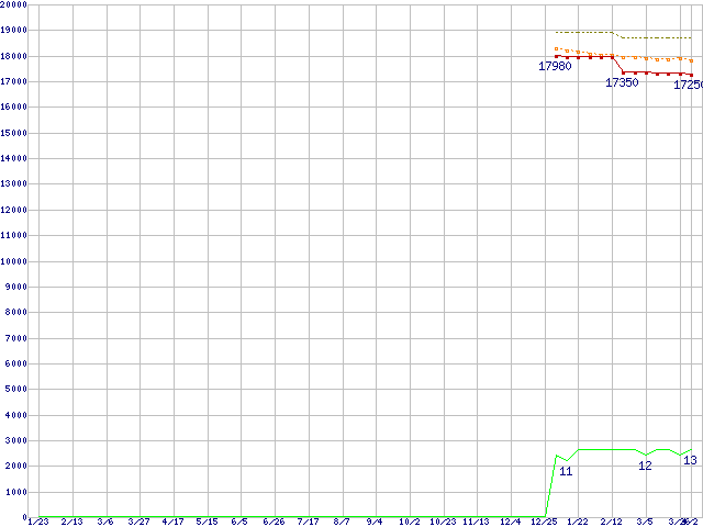 Core i5-650 (3.2GHz)の価格推移↑前グラフ↓次グラフ(2009年1月23日〜2010年4月2日)※このグラフは過去のデータも税率5%相当に調整した税込み相当額のグラフです。●関連グラフCPU主要製品の最安値推移CPU主要製品(最安値1万円〜2万円未満)の最安値推移Intel系CPUの最安値推移LGA1156 (L3キャッシュ4MB,Dual Core,GPU内蔵,Hyper-Threading,TDP 73〜87W)の最安値推移●凡例最安値(点線部は販売店未確認または未調査)平均値最高値ショップ数