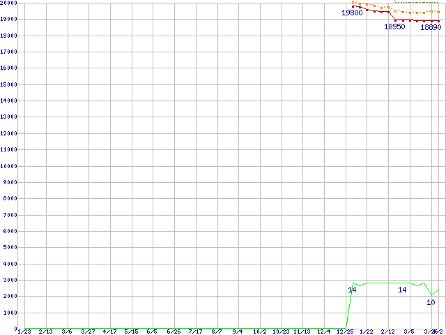 Core i5-660 (3.33GHz)の価格推移↑前グラフ↓次グラフ(2009年1月23日〜2010年4月2日)※このグラフは過去のデータも税率5%相当に調整した税込み相当額のグラフです。●関連グラフCPU主要製品の最安値推移CPU主要製品(最安値1万円〜2万円未満)の最安値推移Intel系CPUの最安値推移LGA1156 (L3キャッシュ4MB,Dual Core,GPU内蔵,Hyper-Threading,TDP 73〜87W)の最安値推移●凡例最安値(点線部は販売店未確認または未調査)平均値最高値ショップ数
