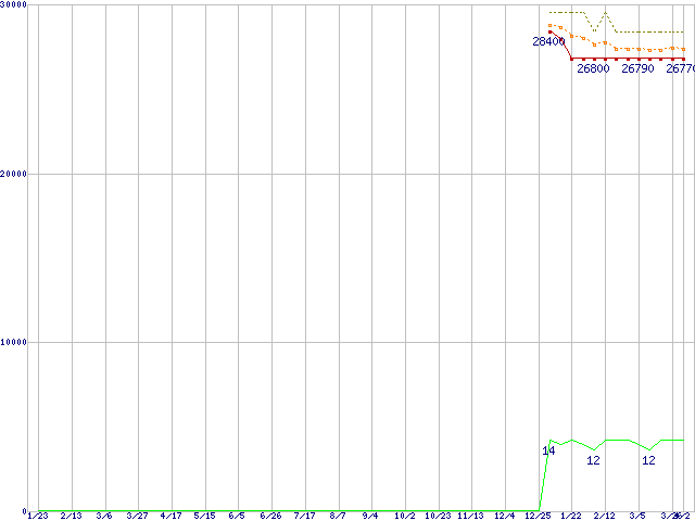 Core i5-670 (3.46GHz)の価格推移↑前グラフ↓次グラフ(2009年1月23日〜2010年4月2日)※このグラフは過去のデータも税率5%相当に調整した税込み相当額のグラフです。●関連グラフCPU主要製品の最安値推移CPU主要製品(最安値2万円〜3万円未満)の最安値推移Intel系CPUの最安値推移LGA1156 (L3キャッシュ4MB,Dual Core,GPU内蔵,Hyper-Threading,TDP 73〜87W)の最安値推移●凡例最安値(点線部は販売店未確認または未調査)平均値最高値ショップ数