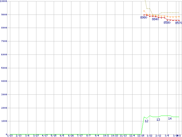 Pentium G6950 (2.8GHz)の価格推移↑前グラフ↓次グラフ(2009年1月23日〜2010年4月2日)※このグラフは過去のデータも税率5%相当に調整した税込み相当額のグラフです。●関連グラフCPU主要製品の最安値推移CPU主要製品(最安値1万円未満)の最安値推移Intel系CPUの最安値推移LGA1156 (L3キャッシュ3MB,Dual Core,GPU内蔵,TDP 73W)の最安値推移●凡例最安値(点線部は販売店未確認または未調査)平均値最高値ショップ数