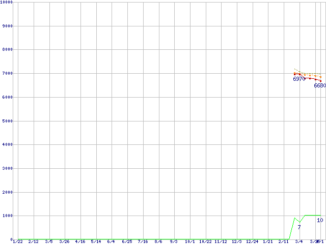 HD103SJ (1TB,32MB)の価格推移↑前グラフ↓次グラフ(2009年1月22日〜2010年4月1日)※このグラフは過去のデータも税率5%相当に調整した税込み相当額のグラフです。 税率変更や、総額表示方式導入(2004年4月)の影響は除いています。●関連グラフHDD/SSD主要製品の最安値推移HDD/SSD主要製品(最安値1万円未満)の最安値推移HDD 1TB〜1.5TB未満の最安値推移Spinpoint F3 (7200rpm,3Gb/s,3.5インチ)の最安値推移●凡例最安値(点線部は販売店未確認または未調査)平均値最高値ショップ数