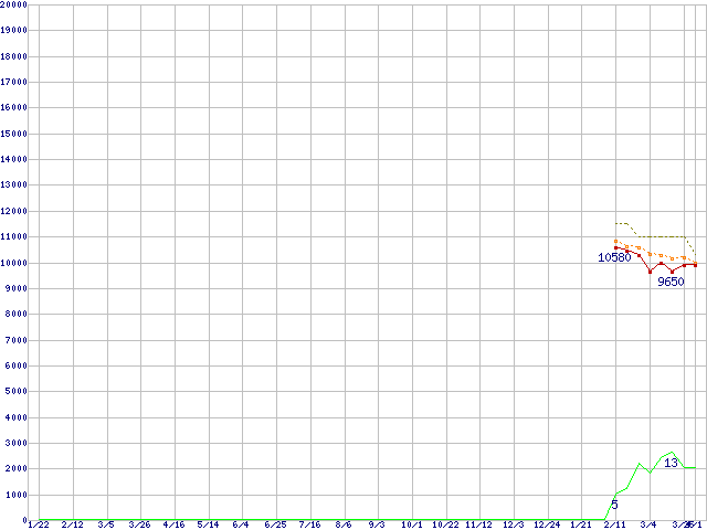 WD1002FAEX (1TB,64MB)の価格推移↑前グラフ↓次グラフ(2009年1月22日〜2010年4月1日)※このグラフは過去のデータも税率5%相当に調整した税込み相当額のグラフです。 税率変更や、総額表示方式導入(2004年4月)の影響は除いています。●関連グラフHDD/SSD主要製品の最安値推移HDD/SSD主要製品(最安値1万円未満)の最安値推移HDD 1TB〜1.5TB未満の最安値推移WD Caviar Black (7200rpm,6Gb/s)の最安値推移●凡例最安値(点線部は販売店未確認または未調査)平均値最高値ショップ数
