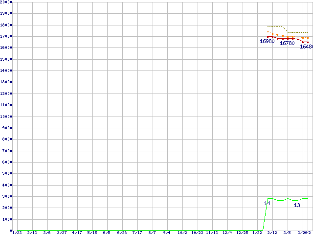 Phenom II X4 910e (2.6GHz,L2 512KB×4,L3 6MB,TDP 65W)の価格推移↑前グラフ↓次グラフ(2009年1月23日〜2010年4月2日)※このグラフは過去のデータも税率5%相当に調整した税込み相当額のグラフです。●関連グラフCPU主要製品の最安値推移CPU主要製品(最安値1万円〜2万円未満)の最安値推移AMD系CPUの最安値推移Socket AM3 (HyperTransport 3.0,Quad Core Core)の最安値推移●凡例最安値(点線部は販売店未確認または未調査)平均値最高値ショップ数