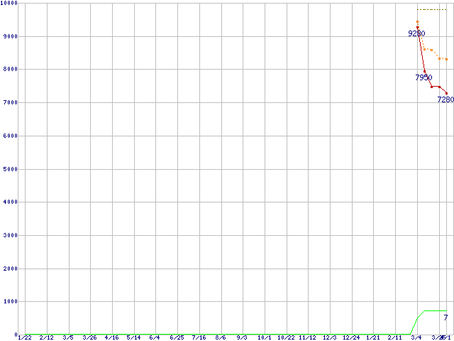 WD10EALS (1TB,32MB)の価格推移↑前グラフ↓次グラフ(2009年1月22日〜2010年4月1日)※このグラフは過去のデータも税率5%相当に調整した税込み相当額のグラフです。 税率変更や、総額表示方式導入(2004年4月)の影響は除いています。●関連グラフHDD/SSD主要製品の最安値推移HDD/SSD主要製品(最安値1万円未満)の最安値推移HDD 1TB〜1.5TB未満の最安値推移WD Caviar Blue (7200rpm,3Gb/s)の最安値推移●凡例最安値(点線部は販売店未確認または未調査)平均値最高値ショップ数