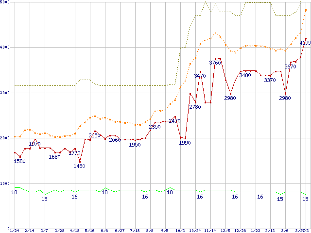 PC2-6400 2GBの価格推移↑前グラフ↓次グラフ(2009年1月24日〜2010年4月3日)※このグラフは過去のデータも税率5%相当に調整した税込み相当額のグラフです。 税率変更や、総額表示方式導入(2004年4月)の影響は除いています。●関連グラフメモリ主要製品の最安値推移2GBモジュール/1GBモジュール×2枚の最安値推移メモリ主要製品(最安値5千円未満)の最安値推移PC2-6400(DDR2-800) DDR2 SDRAM DIMMの最安値推移●凡例最安値(点線部は販売店未確認または未調査)平均値最高値ショップ数