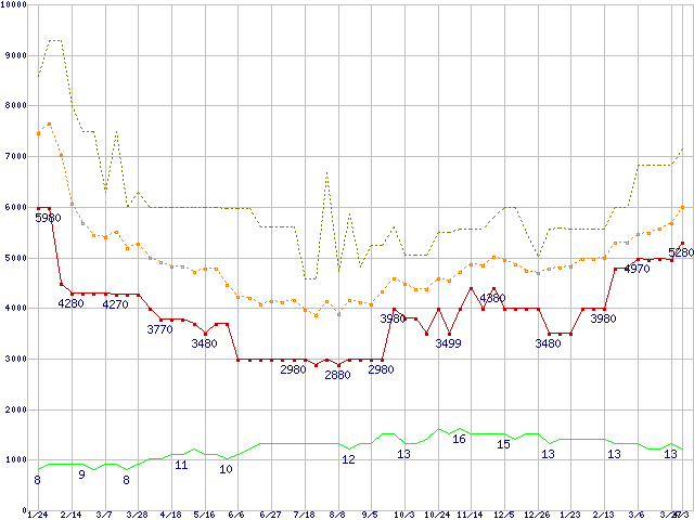 PC3-10600 1GB×2枚組みセットの価格推移↑前グラフ↓次グラフ(2009年1月24日〜2010年4月3日)※このグラフは過去のデータも税率5%相当に調整した税込み相当額のグラフです。 税率変更や、総額表示方式導入(2004年4月)の影響は除いています。●関連グラフメモリ主要製品の最安値推移2GBモジュール/1GBモジュール×2枚の最安値推移メモリ主要製品(最安値5千円〜1万円未満)の最安値推移PC3-10600(DDR3-1333) DDR3 SDRAM DIMMの最安値推移PC3-10600(DDR3-1333)主要モデルの最安値推移●凡例最安値(点線部は販売店未確認または未調査)平均値最高値ショップ数