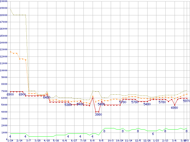 PC3-12800 1GB×2枚組みセットの価格推移↑前グラフ↓次グラフ(2009年1月24日〜2010年4月3日)※このグラフは過去のデータも税率5%相当に調整した税込み相当額のグラフです。 税率変更や、総額表示方式導入(2004年4月)の影響は除いています。●関連グラフメモリ主要製品の最安値推移2GBモジュール/1GBモジュール×2枚の最安値推移メモリ主要製品(最安値5千円〜1万円未満)の最安値推移PC3-12800(DDR3-1600) DDR3 SDRAM DIMMの最安値推移●凡例最安値(点線部は販売店未確認または未調査)平均値最高値ショップ数