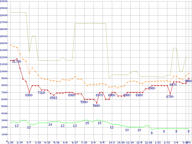 PC3-12800 1GB×3枚組みセットの価格推移↑前グラフ↓次グラフ(2009年1月24日〜2010年4月3日)※このグラフは過去のデータも税率5%相当に調整した税込み相当額のグラフです。 税率変更や、総額表示方式導入(2004年4月)の影響は除いています。●関連グラフメモリ主要製品の最安値推移メモリ主要製品(最安値5千円〜1万円未満)の最安値推移PC3-12800(DDR3-1600) DDR3 SDRAM DIMMの最安値推移●凡例最安値(点線部は販売店未確認または未調査)平均値最高値ショップ数