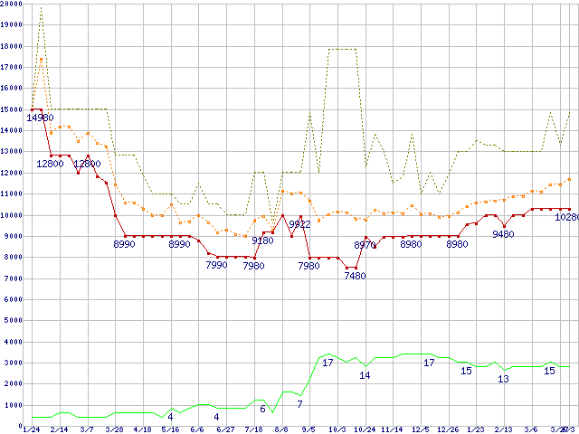 PC3-12800 2GB×2枚組みセットの価格推移↑前グラフ↓次グラフ(2009年1月24日〜2010年4月3日)※このグラフは過去のデータも税率5%相当に調整した税込み相当額のグラフです。 税率変更や、総額表示方式導入(2004年4月)の影響は除いています。●関連グラフメモリ主要製品の最安値推移4GBモジュール/2GBモジュール×2枚の最安値推移メモリ主要製品(最安値1万円以上)の最安値推移PC3-12800(DDR3-1600) DDR3 SDRAM DIMMの最安値推移●凡例最安値(点線部は販売店未確認または未調査)平均値最高値ショップ数