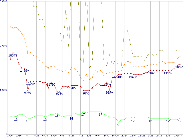 PC3-12800 2GB×3枚組みセットの価格推移↑前グラフ↓次グラフ(2009年1月24日〜2010年4月3日)※このグラフは過去のデータも税率5%相当に調整した税込み相当額のグラフです。 税率変更や、総額表示方式導入(2004年4月)の影響は除いています。●関連グラフメモリ主要製品の最安値推移メモリ主要製品(最安値1万円以上)の最安値推移PC3-12800(DDR3-1600) DDR3 SDRAM DIMMの最安値推移●凡例最安値(点線部は販売店未確認または未調査)平均値最高値ショップ数