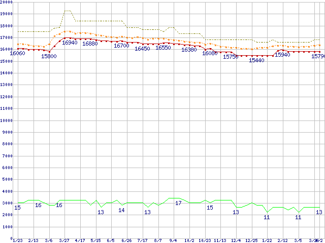 Core 2 Duo E8400 (3GHz,L2 6MB)の価格推移↑前グラフ↓次グラフ(2009年1月23日〜2010年4月2日)※このグラフは過去のデータも税率5%相当に調整した税込み相当額のグラフです。●関連グラフCPU主要製品の最安値推移CPU主要製品(最安値1万円〜2万円未満)の最安値推移Intel系CPUの最安値推移LGA775 (FSB 1333MHz,Dual Core,TDP 65W)の最安値推移●凡例最安値(点線部は販売店未確認または未調査)平均値最高値ショップ数