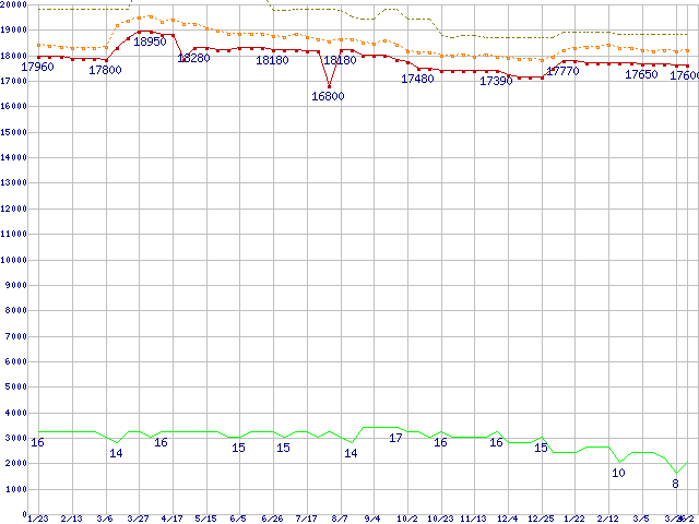 Core 2 Duo E8500 (3.16GHz,L2 6MB)の価格推移↑前グラフ↓次グラフ(2009年1月23日〜2010年4月2日)※このグラフは過去のデータも税率5%相当に調整した税込み相当額のグラフです。●関連グラフCPU主要製品の最安値推移CPU主要製品(最安値1万円〜2万円未満)の最安値推移Intel系CPUの最安値推移LGA775 (FSB 1333MHz,Dual Core,TDP 65W)の最安値推移●凡例最安値(点線部は販売店未確認または未調査)平均値最高値ショップ数