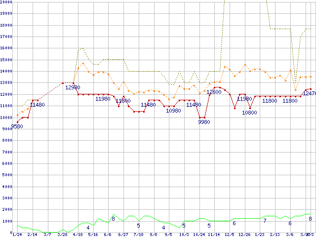PC2-6400 4GBの価格推移↑前グラフ(2009年1月24日〜2010年4月3日)※このグラフは過去のデータも税率5%相当に調整した税込み相当額のグラフです。 税率変更や、総額表示方式導入(2004年4月)の影響は除いています。●関連グラフメモリ主要製品の最安値推移4GBモジュール/2GBモジュール×2枚の最安値推移メモリ主要製品(最安値1万円以上)の最安値推移PC2-6400(DDR2-800) DDR2 SDRAM DIMMの最安値推移●凡例最安値(点線部は販売店未確認または未調査)平均値最高値ショップ数