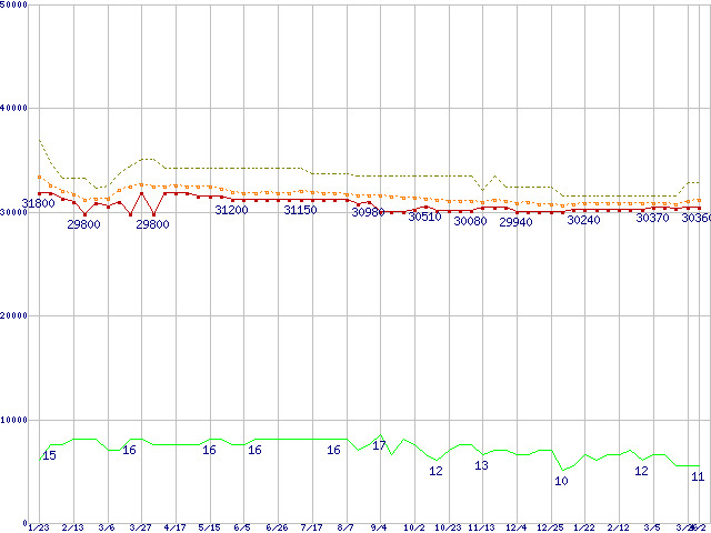 Core 2 Quad Q9650 (3.00GHz,L2 6MB×2)の価格推移↑前グラフ↓次グラフ(2009年1月23日〜2010年4月2日)※このグラフは過去のデータも税率5%相当に調整した税込み相当額のグラフです。●関連グラフCPU主要製品の最安値推移CPU主要製品(最安値3万円〜6万円未満)の最安値推移Intel系CPUの最安値推移LGA775 (FSB 1333MHz,Quad Core,TDP 95W)の最安値推移●凡例最安値(点線部は販売店未確認または未調査)平均値最高値ショップ数
