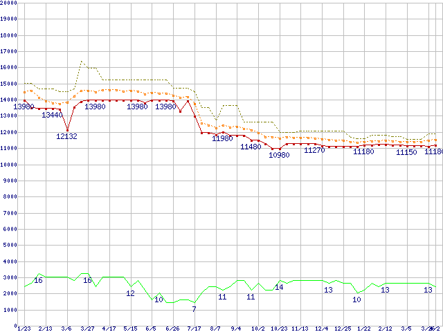 Core 2 Duo E7500 (2.93GHz,L2 3MB)の価格推移↑前グラフ↓次グラフ(2009年1月23日〜2010年4月2日)※このグラフは過去のデータも税率5%相当に調整した税込み相当額のグラフです。●関連グラフCPU主要製品の最安値推移CPU主要製品(最安値1万円〜2万円未満)の最安値推移Intel系CPUの最安値推移LGA775 (FSB 1066MHz,Dual Core,TDP 65W)の最安値推移●凡例最安値(点線部は販売店未確認または未調査)平均値最高値ショップ数