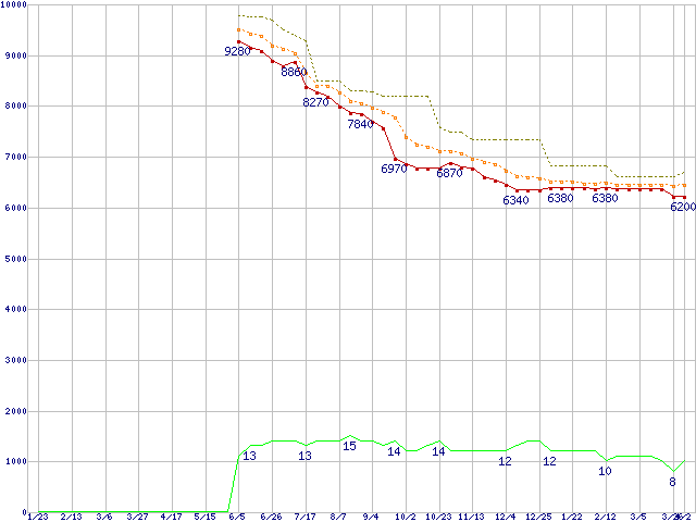 Athlon II X2 250 (3.0GHz,L2 1MB×2,TDP 65W)の価格推移↑前グラフ↓次グラフ(2009年1月23日〜2010年4月2日)※このグラフは過去のデータも税率5%相当に調整した税込み相当額のグラフです。●関連グラフCPU主要製品の最安値推移CPU主要製品(最安値1万円未満)の最安値推移AMD系CPUの最安値推移Socket AM3 (Dual Core)の最安値推移●凡例最安値(点線部は販売店未確認または未調査)平均値最高値ショップ数