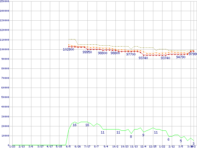 Core i7-975 Extreme Edition (3.33GHz)の価格推移↑前グラフ↓次グラフ(2009年1月23日〜2010年4月2日)※このグラフは過去のデータも税率5%相当に調整した税込み相当額のグラフです。●関連グラフCPU主要製品の最安値推移CPU主要製品(最安値6万円以上)の最安値推移Intel系CPUの最安値推移LGA1366 (QPI 6.4GT/s,L3キャッシュ8MB,Quad Core,Hyper-Threading,TDP 130W)の最安値推移●凡例最安値(点線部は販売店未確認または未調査)平均値最高値ショップ数
