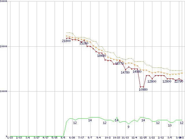 Phenom II X4 945 (3.0GHz,L2 512KB×4,L3 6MB,TDP 95W)の価格推移↑前グラフ↓次グラフ(2009年1月23日〜2010年4月2日)※このグラフは過去のデータも税率5%相当に調整した税込み相当額のグラフです。●関連グラフCPU主要製品の最安値推移CPU主要製品(最安値1万円〜2万円未満)の最安値推移AMD系CPUの最安値推移Socket AM3 (HyperTransport 3.0,Quad Core Core)の最安値推移●凡例最安値(点線部は販売店未確認または未調査)平均値最高値ショップ数