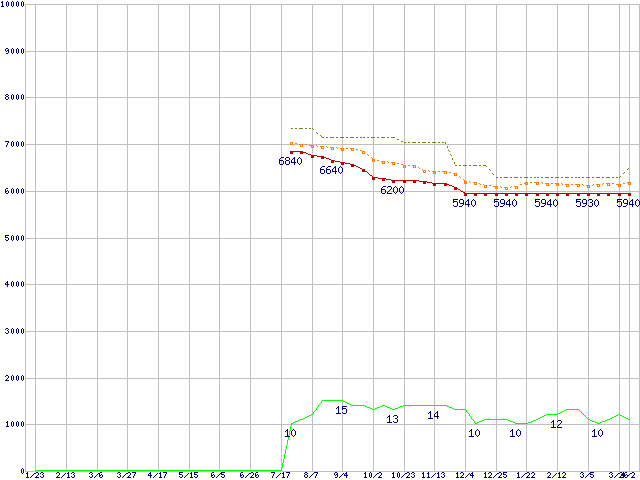 Athlon II X2 245 (2.9GHz,L2 1MB×2,TDP 65W)の価格推移↑前グラフ↓次グラフ(2009年1月23日〜2010年4月2日)※このグラフは過去のデータも税率5%相当に調整した税込み相当額のグラフです。●関連グラフCPU主要製品の最安値推移CPU主要製品(最安値1万円未満)の最安値推移AMD系CPUの最安値推移Socket AM3 (Dual Core)の最安値推移●凡例最安値(点線部は販売店未確認または未調査)平均値最高値ショップ数