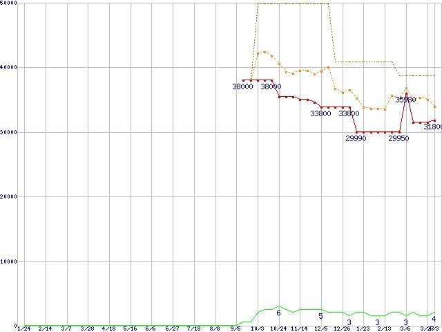 PC3-10600 4GB×2枚組みセットの価格推移↑前グラフ↓次グラフ(2009年1月24日〜2010年4月3日)※このグラフは過去のデータも税率5%相当に調整した税込み相当額のグラフです。 税率変更や、総額表示方式導入(2004年4月)の影響は除いています。●関連グラフメモリ主要製品の最安値推移メモリ主要製品(最安値1万円以上)の最安値推移PC3-10600(DDR3-1333) DDR3 SDRAM DIMMの最安値推移●凡例最安値(点線部は販売店未確認または未調査)平均値最高値ショップ数