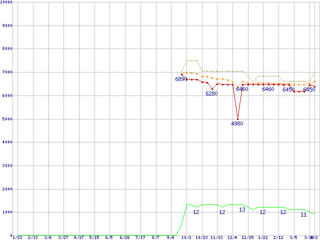 Athlon II X2 235e (2.7GHz,L2 1MB×2,TDP 45W)の価格推移↑前グラフ↓次グラフ(2009年1月23日〜2010年4月2日)※このグラフは過去のデータも税率5%相当に調整した税込み相当額のグラフです。●関連グラフCPU主要製品の最安値推移CPU主要製品(最安値1万円未満)の最安値推移AMD系CPUの最安値推移Socket AM3 (Dual Core)の最安値推移●凡例最安値(点線部は販売店未確認または未調査)平均値最高値ショップ数