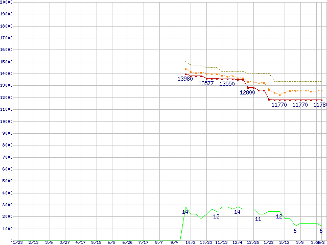 Athlon II X4 605e (2.3GHz,L2 512KB×4,TDP 45W)の価格推移↑前グラフ↓次グラフ(2009年1月23日〜2010年4月2日)※このグラフは過去のデータも税率5%相当に調整した税込み相当額のグラフです。●関連グラフCPU主要製品の最安値推移CPU主要製品(最安値1万円〜2万円未満)の最安値推移AMD系CPUの最安値推移Socket AM3 (Quad Core)の最安値推移●凡例最安値(点線部は販売店未確認または未調査)平均値最高値ショップ数
