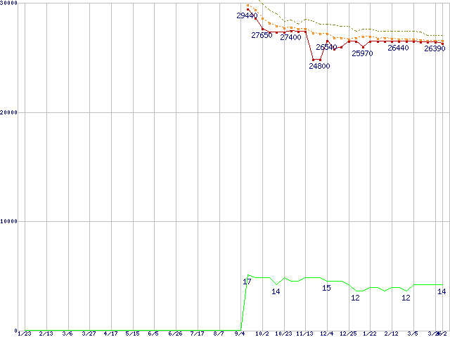 Core i7-860 (2.80GHz)の価格推移↑前グラフ↓次グラフ(2009年1月23日〜2010年4月2日)※このグラフは過去のデータも税率5%相当に調整した税込み相当額のグラフです。●関連グラフCPU主要製品の最安値推移CPU主要製品(最安値2万円〜3万円未満)の最安値推移Intel系CPUの最安値推移LGA1156 (L3キャッシュ8MB,Quad Core,Hyper-Threading,TDP 82〜95W)の最安値推移●凡例最安値(点線部は販売店未確認または未調査)平均値最高値ショップ数