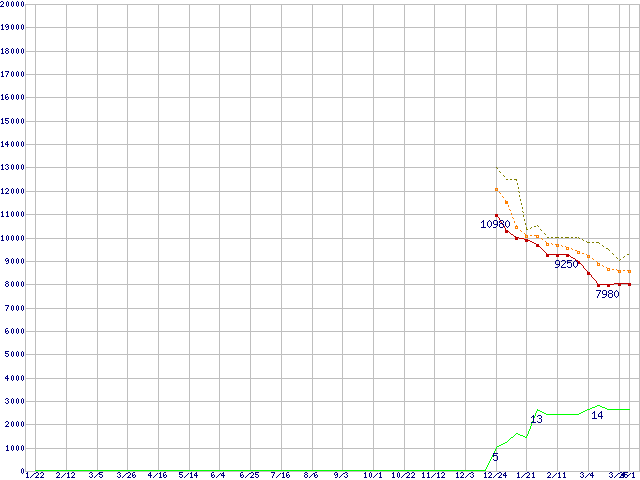 WD15EARS (1.5TB,64MB)の価格推移↑前グラフ(2009年1月22日〜2010年4月1日)※このグラフは過去のデータも税率5%相当に調整した税込み相当額のグラフです。 税率変更や、総額表示方式導入(2004年4月)の影響は除いています。●関連グラフHDD/SSD主要製品の最安値推移HDD/SSD主要製品(最安値1万円未満)の最安値推移HDD 1.5TB〜2TB未満の最安値推移WD Caviar Green (3Gb/s)の最安値推移●凡例最安値(点線部は販売店未確認または未調査)平均値最高値ショップ数