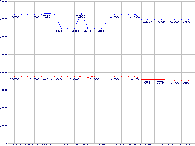 | ※製品名をクリックすると個別のグラフを表示します ※点線部は販売店が確認できなかった、または調査データがないことを示します |