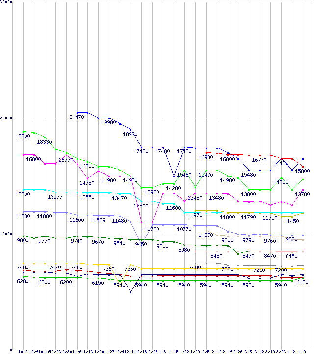 AMD系CPUの最安値推移↑前グラフ↓次グラフ(2009年10月2日〜2010年4月9日)※このグラフは過去のデータも税率5%相当に調整した税込み相当額のグラフです。凡例Phenom II X4 965 Black Edition (3.4GHz,L2 512KB×4,L3 6MB,TDP 125W)Phenom II X4 910e (2.6GHz,L2 512KB×4,L3 6MB,TDP 65W)Phenom II X4 955 Black Edition (3.2GHz,L2 512KB×4,L3 6MB,TDP 125W)Phenom II X4 945 (3.0GHz,L2 512KB×4,L3 6MB,TDP 95W)Athlon II X4 605e (2.3GHz,L2 512KB×4,TDP 45W)Athlon II X4 635 (2.9GHz,L2 512KB×4,TDP 95W)Athlon II X4 630 (2.8GHz,L2 512KB×4,TDP 95W)Phenom II X2 555 Black Edition (3.2GHz,L2 512KB×2,L3 6MB)Athlon II X4 620 (2.6GHz,L2 512KB×4,TDP 95W)Athlon II X3 440 (3.0GHz,L2 512KB×3,TDP 95W)Athlon II X2 255 (3.1GHz,L2 1MB×2,TDP 65W)Athlon II X2 240e (2.8GHz,L2 1MB×2,TDP 45W)Athlon II X2 235e (2.7GHz,L2 1MB×2,TDP 45W)Athlon II X2 250 (3.0GHz,L2 1MB×2,TDP 65W)Athlon II X2 245 (2.9GHz,L2 1MB×2,TDP 65W)※製品名をクリックすると個別のグラフを表示します※点線部は販売店が確認できなかった、または調査データがないことを示します