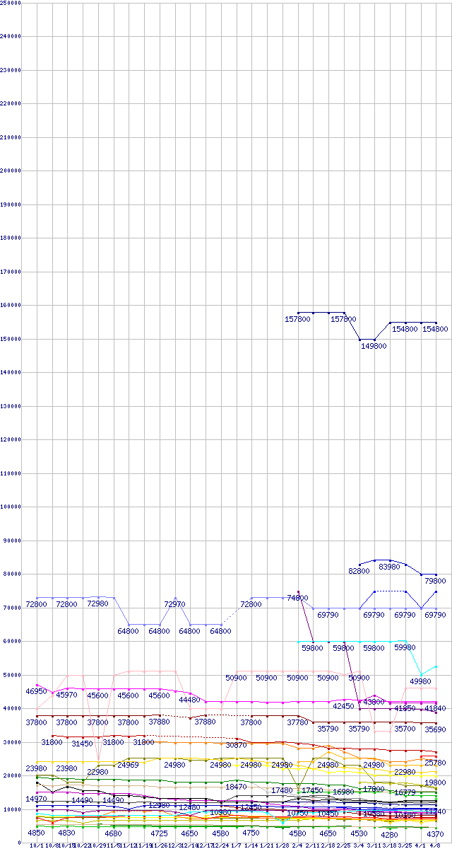 HDD/SSD主要製品の最安値推移↑前グラフ↓次グラフ(2009年10月1日〜2010年4月8日)※このグラフは過去のデータも税率5%相当に調整した税込み相当額のグラフです。 税率変更や、総額表示方式導入(2004年4月)の影響は除いています。凡例2.5インチ ミドルクラスSSD 512GB (512GB,MLC)2.5インチSSD(SandForce製コントローラ) 200GB (200GB,MLC)CTFDDAC256MAG-1G1 (256GB,MLC)SSDSA2SH064G1C5 (64GB,SLC)2.5インチ ミドルクラスSSD 256GB (256GB,MLC)2.5インチ ローエンドSSD 256GB (256GB,MLC)SDSA2MH160G2C1/R1/R5 (160GB,MLC)CTFDDAC128MAG-1G1 (128GB,MLC)2.5インチSSD(SandForce製コントローラ) 100GB (100GB,MLC)SSDSA2SH032G1 (32GB,SLC)WD2001FASS (2TB,64MB)2.5インチSSD(SandForce製コントローラ) 50GB (50GB,MLC)ST32000641AS (2TB,64MB)2.5インチ ミドルクラスSSD 128GB (128GB,MLC)SDSA2MH80G2C1/R1/R5 (80GB,MLC)X25-M(G2)OEM品SSD (80GB,MLC)WD10TPVT (1TB,8MB,12.5mm厚)2.5インチ ローエンドSSD 128GB (128GB,MLC)WD1500HLFS (150.0GB)ST32000542AS (2TB,32MB)2.5インチ ミドルクラスSSD 64GB (64GB,MLC)WD7500BPVT (750GB,8MB)HDS722020ALA330 (2TB,32MB)2.5インチ ローエンドSSD 64GB (64GB,MLC)HD203WI (2TB,32MB)WD20EARS (2TB,64MB)SSDSA2MP040G2R5 (40GB,MLC)ST31500341AS (1.5TB,32MB)WD1002FAEX (1TB,64MB)WD6400BPVT (640GB,8MB)2.5インチ ローエンドSSD 32GB (32GB,MLC)2.5インチ ミドルクラスSSD 32GB (32GB,MLC)HM641JI (640GB,8MB)WD6400BEVT (640GB,8MB)HD154UI (1.5TB,32MB)WD15EARS (1.5TB,64MB)WD10EALS (1TB,32MB)ST31000528AS (1TB,32MB)HDS721010CLA332 (1TB,32MB)HD103SJ (1TB,32MB)WD10EARS (1TB,64MB)WD5000BEVT (500GB,8MB)HD103SI (1TB,32MB)HTS545050B9A300 (500GB,8MB)HTS545032B9A300 (320GB,8MB)HDS721050CLA362 (500GB,16MB)ST3500418AS (500GB,16MB)※製品名をクリックすると個別のグラフを表示します※点線部は販売店が確認できなかった、または調査データがないことを示します