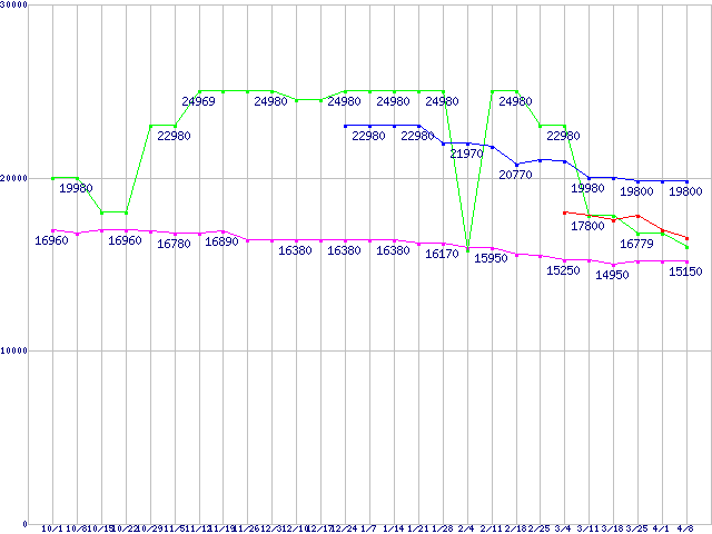 | HDD/SSD主要製品(最安値1万5千円〜2万円未満)の最安値推移 |