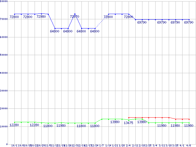 | HDD/SSD 60GB〜80GB未満の最安値推移 |