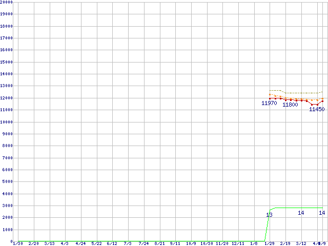 Athlon II X4 635 (2.9GHz,L2 512KB×4,TDP 95W)の価格推移↑前グラフ↓次グラフ(2009年1月30日〜2010年4月9日)※このグラフは過去のデータも税率5%相当に調整した税込み相当額のグラフです。●関連グラフCPU主要製品の最安値推移CPU主要製品(最安値1万円〜2万円未満)の最安値推移AMD系CPUの最安値推移Socket AM3 (Quad Core)の最安値推移●凡例最安値(点線部は販売店未確認または未調査)平均値最高値ショップ数