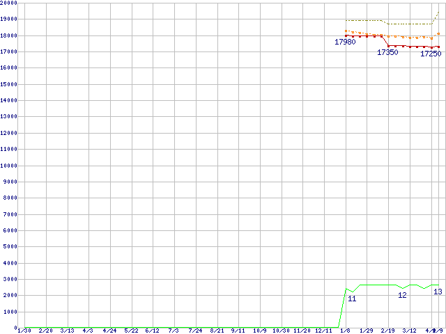 Core i5-650 (3.2GHz)の価格推移↑前グラフ↓次グラフ(2009年1月30日〜2010年4月9日)※このグラフは過去のデータも税率5%相当に調整した税込み相当額のグラフです。●関連グラフCPU主要製品の最安値推移CPU主要製品(最安値1万円〜2万円未満)の最安値推移Intel系CPUの最安値推移LGA1156 (L3キャッシュ4MB,Dual Core,GPU内蔵,Hyper-Threading,TDP 73〜87W)の最安値推移●凡例最安値(点線部は販売店未確認または未調査)平均値最高値ショップ数