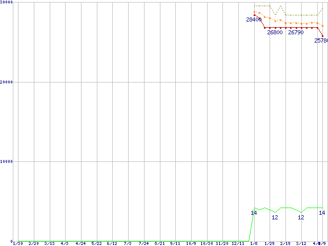 Core i5-670 (3.46GHz)の価格推移↑前グラフ↓次グラフ(2009年1月30日〜2010年4月9日)※このグラフは過去のデータも税率5%相当に調整した税込み相当額のグラフです。●関連グラフCPU主要製品の最安値推移CPU主要製品(最安値2万円〜3万円未満)の最安値推移Intel系CPUの最安値推移LGA1156 (L3キャッシュ4MB,Dual Core,GPU内蔵,Hyper-Threading,TDP 73〜87W)の最安値推移●凡例最安値(点線部は販売店未確認または未調査)平均値最高値ショップ数