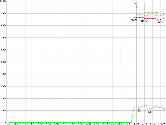 Pentium E6600 (3.06GHz,L2 2MB)の価格推移↑前グラフ↓次グラフ(2009年1月30日〜2010年4月9日)※このグラフは過去のデータも税率5%相当に調整した税込み相当額のグラフです。●関連グラフCPU主要製品の最安値推移CPU主要製品(最安値1万円未満)の最安値推移Intel系CPUの最安値推移LGA775 (FSB 1066MHz,Dual Core,TDP 65W)の最安値推移●凡例最安値(点線部は販売店未確認または未調査)平均値最高値ショップ数