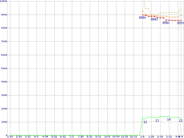 Pentium G6950 (2.8GHz)の価格推移↑前グラフ↓次グラフ(2009年1月30日〜2010年4月9日)※このグラフは過去のデータも税率5%相当に調整した税込み相当額のグラフです。●関連グラフCPU主要製品の最安値推移CPU主要製品(最安値1万円未満)の最安値推移Intel系CPUの最安値推移LGA1156 (L3キャッシュ3MB,Dual Core,GPU内蔵,TDP 73W)の最安値推移●凡例最安値(点線部は販売店未確認または未調査)平均値最高値ショップ数