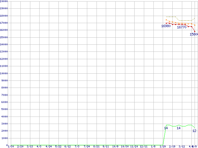 Phenom II X4 910e (2.6GHz,L2 512KB×4,L3 6MB,TDP 65W)の価格推移↑前グラフ↓次グラフ(2009年1月30日〜2010年4月9日)※このグラフは過去のデータも税率5%相当に調整した税込み相当額のグラフです。●関連グラフCPU主要製品の最安値推移CPU主要製品(最安値1万円〜2万円未満)の最安値推移AMD系CPUの最安値推移Socket AM3 (HyperTransport 3.0,Quad Core Core)の最安値推移●凡例最安値(点線部は販売店未確認または未調査)平均値最高値ショップ数